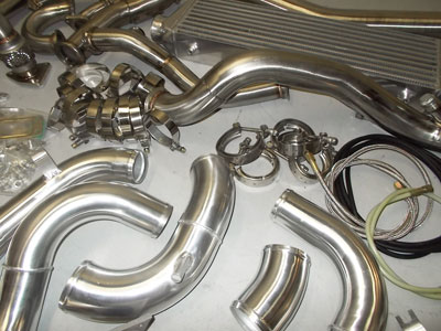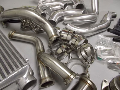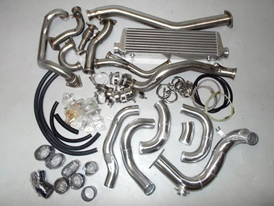 Kanji Brand Turbo Kit for 2003 to 2006 350Z/G35, tig welded aluminum intercooler piping, multi-ply couplers and Tbolt clamps, stainless steel exhaust piping, Vbanded piping, thick intercooler, set up for 39mm wastegate and T3 flanged turbo, $1799 for the kit, $2899 with a Precision 39mm wastegate (set up for 3 to 17psi) and Precision Billet Compressor Wheel Turbo, such as 5862 all the way to 6262 (price can be slightly cheaper with a Precision Entry Level Turbo)