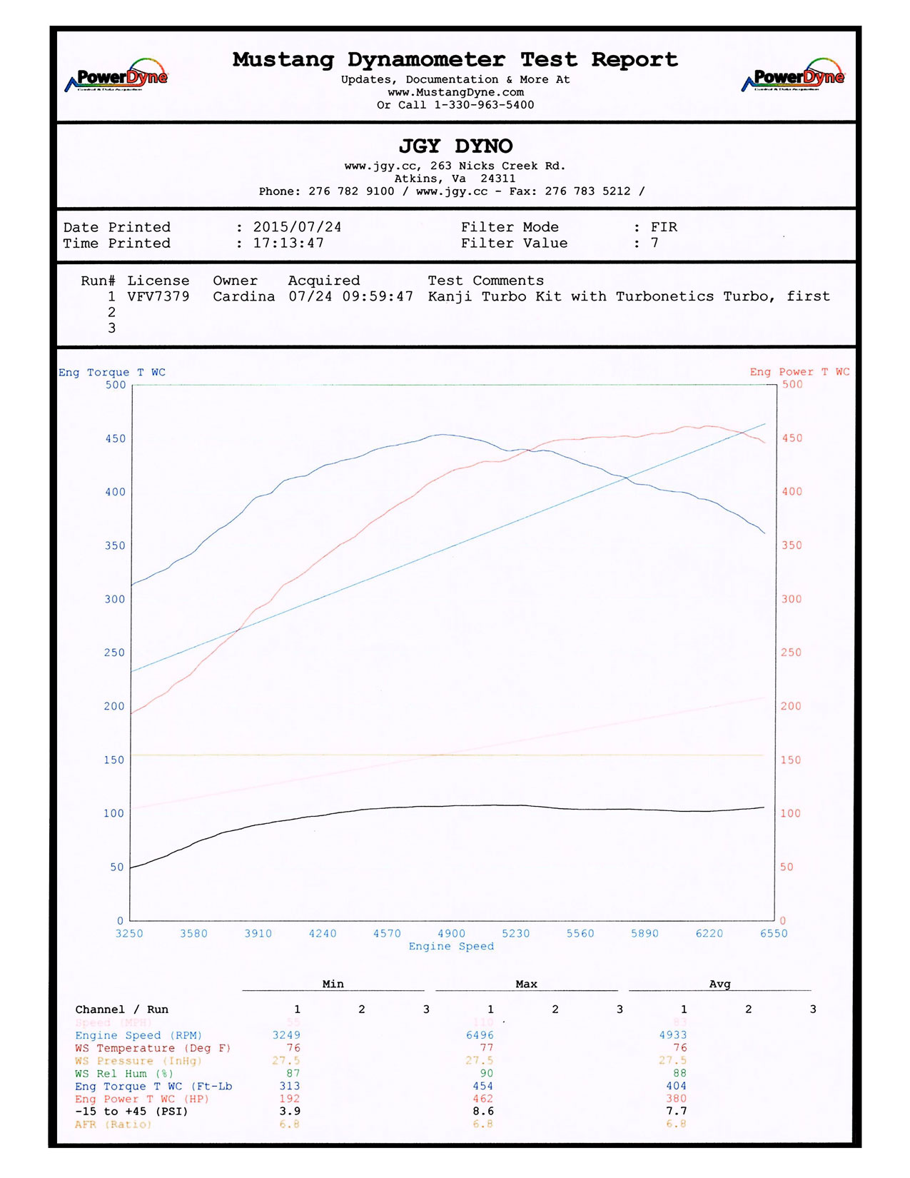 Click here to see the dyno chart: 462HP and 454tq at 8.5psi