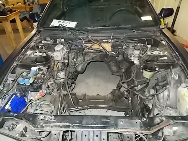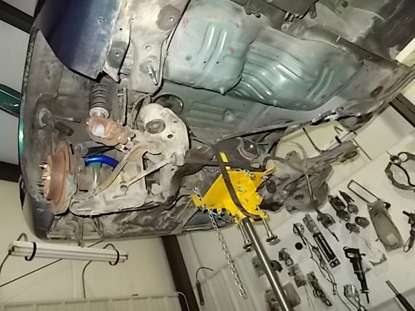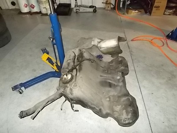 Another shop put a hole in Brian's gas tank, so we need to replace it for him. First, we dropped the rear end to get the tank out.