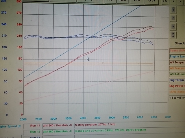 With the Uprev tuning, we gained 6 HP and 6ft/lbs of torque, with gains all across the board with the tuning skills of Jason behind the laptop, starting with 237HP and 214tq, up to 243hp and 220.3tq