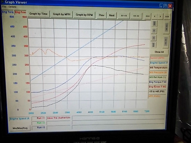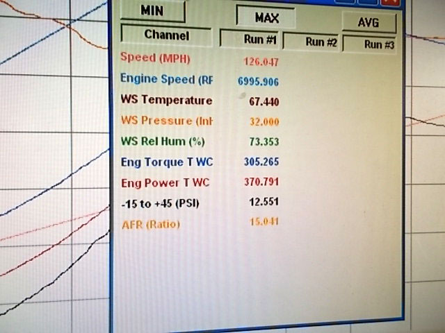 Before tuning. At the beginning, we got 370HP and 305tq at 9.x psi. (chart shows 12, but that is the peak, at the 370HP mark and RPM level, he was 9.x psi)